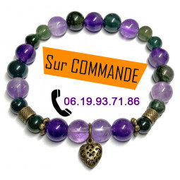 Bracelet boules, pour femme, élastique en Améthyste et Agate Mousse composé de petites boules ou perles en pierres naturelles semi-précieuses pour la Lithothérapie. Un bracelet de création unique et originale d'un diamètre de 51 mm et d'une longueur de 18 cm, composé de minéraux pour un bien-être...