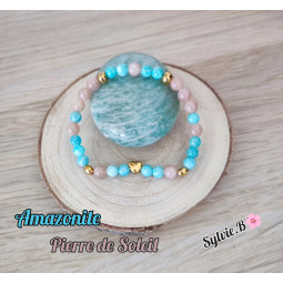 Bracelet boules pour femme, élastique en Amazonite et Pierre de Soleil composé de petites boules ou perles en pierres naturelles semi-précieuses pour la Lithothérapie. Un bracelet de création unique et originale d'un diamètre de 52 mm et d'une longueur de 18 cm composé de minéraux pour un...