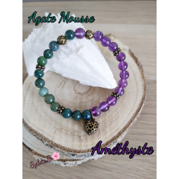Bracelet boules, pour femme, élastique en Agate Mousse et Améthyste composé de petites boules ou perles en pierres naturelles semi-précieuses pour la Lithothérapie. Un bracelet de création unique et originale d'un diamètre de 55 mm et d'une longueur de 19 cm, composé de minéraux pour un bien-être...