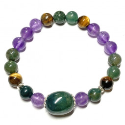 Bracelet boules, pour femme, élastique en Agate Mousse, Œil de Tigre & Améthyste composé de petites boules ou perles en pierres naturelles semi-précieuses pour la Lithothérapie. Un bracelet de création unique et originale d'un diamètre de 55 mm et d'une longueur de 19 cm, composé de minéraux...