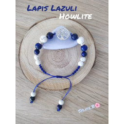 Bracelet boules, pour femme, macramé en Lapis Lazuli (ou Lazulite) et Howlite composé de petites boules ou perles en pierres naturelles semi-précieuses pour la Lithothérapie. Un bracelet de création unique et originale ajustable d'un diamètre minimum de 42 mm à maximum 65 mm et d'une longueur...