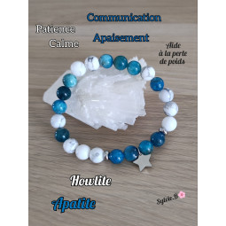 Bracelet boules, pour femme, élastique en Howlite et Apatite composé de petites boules ou perles en pierres naturelles semi-précieuses pour la Lithothérapie. Un bracelet de création unique et originale d'un diamètre de 55 mm et d'une longueur de 19 cm composé de minéraux pour un bien-être au...