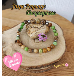 Bracelet boules, pour femme, élastique en Jaspe Paysage et Chrysoprase composé de petites boules ou perles en pierres naturelles semi-précieuses pour la Lithothérapie. Un bracelet de création unique et originale d'un diamètre de 51 mm et d'une longueur de 18 cm composé de minéraux pour un...