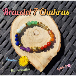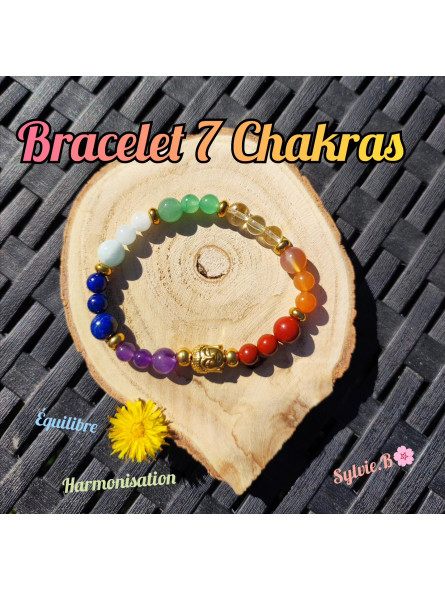- Ce bracelet est composé de sept pierres naturelles différentes aux couleurs en parfaite résonance avec les points énergétiques du corps. Ce bijou original est une création unique avec des perles de 8 et 6 mm qui représentent les 7 chakras, une perle représentant la tête du Bouddha Tibétain en Acier Inoxydable doré entourée de deux perles rondes aplaties en Acier Inoxydable doré ainsi que six autres perles plus petites mais également aplaties et toujours en Acier Inoxydable doré qui sont intercalées aux perles et ainsi permettant de délimiter les rangs de perles aux couleurs de chaque chakras, ceci lui donne encore plus d'originalité de féminité.