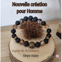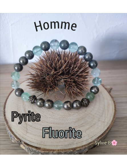 Bracelet boules pour homme, une création unique, une création originale avec deux perles travaillé en métal de couleur bronze et qui sont intercalées aux perles de 8 mm qui sont en pierres naturelles ou pierres semi-précieuses. En Lithothérapie, il est reconnu que chaque pierre naturelle a ses propres vertus et c'est en les portant que nous pouvons profiter des bienfaits des minéraux. La première pierre naturelle, présente sur ce joli bracelet symétrique, est la Fluorite, ou Fluorine. La Fluorite est une pierre naturelle qui permet d'harmoniser les quatre éléments fondamentaux en nous, la terre, l'eau, le feu et l'air. C'est la pierre semi-précieuse idéale pour surmonter toute forme de désorganisation. Grâce à son énergie, la Fluorite aide à développer la concentration et l'esprit d'analyse. A cela ce très joli minéral permet de se libérer des blocages psychologiques, des sensations de stagnation. Équilibrante, la Fluorite ouvre la conscience aux réalités de l'amour inconditionnel. Cette pierre naturelle soulage également les colères et est efficace contre les états de tristesse. Sur le plan physique la Fluorite agirait positivement sur les problèmes cutanés et osseux. La deuxième pierre naturelle est la Pyrite. La Pyrite est la pierre semi-précieuse de l'organisation, de l'ordre, du raisonnement. Ce minéral aide au rétablissement des polarités du corps physique. Un autre bienfait de la Pyrite consiste à faciliter la restructuration du mental, à cela se rajoutent la stimulation des facultés intellectuelles et la rationalité de la pensée. Sur le plan physique la Pyrite améliorerait la santé de voies respiratoires et renforcerait le système nerveux. Un bracelet pour la confiance en soi, l'organisation et les facultés intellectuelles.
