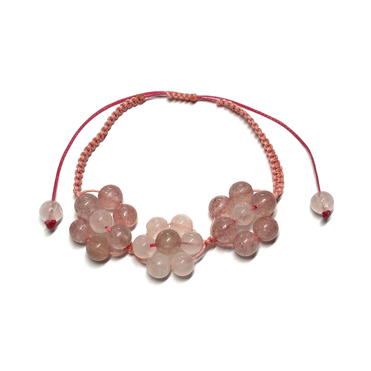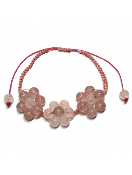 Bracelet boules, pour femme, macramé en Quartz Rose et Quartz Hématoïde ou Quartz Fraise composé de petites boules ou perles en pierres naturelles semi-précieuses pour la Lithothérapie. Un bracelet de création unique et originale ajustable d'un diamètre minimum de 40 mm à maximum 65 mm et d'une longueur minimum de 14 cm à 20 cm maximum composé de minéraux pour un bien-être au quotidien.
