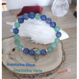 Cette création unique est un bracelet boules pour femme, un bracelet très originale avec son pendentif en Argent 925 représentant une plume et ses deux rondelles striées également en Argent. Un bracelet symétrique, sauf autour de la plume, avec ses perles en pierres naturelles ou semi-précieuses, de 8 mm. Les deux pierres naturelles qui composent ce bijou sont la l'Aventurine Bleue et l'Aventurine Verte. La Lithothérapie permet d'étudier et de répertorier les bienfaits des pierres naturelles grâce à leurs vertus et c'est en les portant que nous en bénéficions. La première pierre naturelle est l'Aventurine Bleue. l'Aventurine bleue apporte la sérénité. Cette pierre naturelle calme les hypersensibles mais également les personnes au tempérament irascible. C'est en stimulant le chakra de la gorge que l'Aventurine bleue facilite une communication douce et apaisante, mais ce joli minéral bleu stimule également le chakra du troisième œil et amplifie aussi la vision psychique. Continuons avec les vertus de l'Aventurine Verte qui sont très intéressantes. C'est la pierre naturelle de la tranquillité intérieure et de la créativité. Cette pierre semi- précieuse est celle des artistes. L'Aventurine Verte, tendre et bienfaisante, va aider à savoir ce que l'on veut vraiment, elle est recommandée pour les adolescents ou les personnes qui se cherchent. L'Aventurine Verte aide à équilibrer les énergies et ainsi ramène au contrôle des situations. Cette pierre naturelle dissout les pensées et les émotions négatives. Minéral qui aide au self contrôle et à faire les bons choix. C'est la pierre semi-précieuse du lâcher prise, de la patience et de la tranquillité intérieure. l'Aventurine Verte aspire au bien-être intérieur et au calme émotionnel.