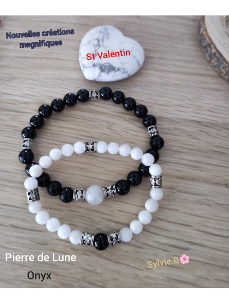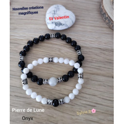 Un duo de partage, deux bracelets boules pour un couple, des créations uniques et originales, harmonisation du Yin et du Yang, des bijoux qui marquent la complicité entre l'homme et la femme. Tous les deux composés de deux pierres naturelles ou semi-précieuses, les deux bracelets sont ornés pour chacun d'eux de cinq séparateurs sur lesquels on peut voir des trèfles, séparateurs en métal argenté. Les pierres naturelles qui symbolisent bien les extrêmes, du fait de leur couleur, sont la Pierre de Lune, qui est blanche, qui symbolise le Yang et l'Onyx qui est noire et qui représente le Yin. En Lithothérapie, nous savons que les pierres naturelles ou semi-précieuses partagent leurs vertus et nous pouvons donc profiter des bienfaits des minéraux. Ces bracelets, en plus de leur symbolique, sont aussi des bijoux de bien-être. Commençons par la Pierre de Lune, plus présente sur le bracelet pour Madame. La Pierre de Lune est la pierre de la féminité car elle stimule l'aspect féminin, le côté Yin de notre nature et rééquilibre les énergies masculines et féminines. Cette jolie pierre semi-précieuse apaise les émotions et aide à une stabilité émotionnelle. La Pierre de Lune permet de s'ouvrir en profondeur aux sentiments. Toujours en lien avec la féminité, ce minéral permet également de stimuler le développement de l'intuition. La Pierre de Lune apporte une aide lors des changements naturelles de la femme, comme réduire les douleurs liées aux règles douloureuses ou aux bouffées de chaleur. Continuons maintenant par L'onyx et qui est plus présent sur le bracelet de Monsieur. L'Onyx est symbole de force, pierre d'ancrage à la terre, très beau minéral noir. C'est une pierre semi-précieuse qui est un soutien dans les moments difficiles en recentrant les énergies. L'Onyx est une pierre naturelle de protection car elle disperse les énergies négatives et permet la stabilité. C'est aussi une pierre naturelle qui aide à la confiance en soi en développant le sens des responsabilités et le self contrôle. Ce joli minéral noir favorise les rêves divinatoires tout comme l'intuition mais tout en protégeant des influences néfastes. Le bracelet féminin est en perles de 6 mm et le bracelet masculin est en perles de 8 mm