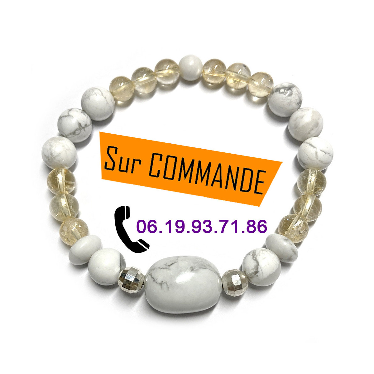Ce bracelet élastique en Citrine et Howlite est composé de petites boules ou perles en pierres naturelles intercalées d'une perle grosse perle ovale en Howlite et 2 perles facettées en Argent.