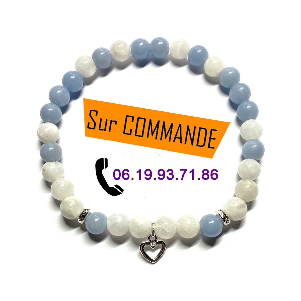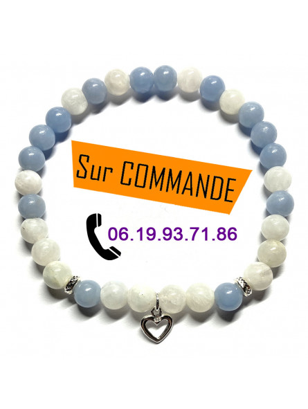 Ce bracelet boules pour femme est une création unique, il est très féminin et original avec son très joli cœur évidé en Argent et ses deux rondelles striées en Argent également. Ce joli bracelet est composé de deux pierres naturelles ou semi-précieuses, qui sont l'Angélite et la Pierre de Lune, en perles de 6 mm et de 8 mm. Les vertus des pierres naturelles sont reconnues Lithothérapie et c'est en les portant que nous bénéficions des bienfaits des minéraux La première pierre naturelle sur ce bracelet boules est la Pierre de Lune. Cette belle pierre naturelle harmonise le côté Yin de notre nature et rééquilibre les énergies masculines et féminines. La Pierre de Lune est la pierre de la féminité car elle stimule l'aspect féminin. Cette très belle pierre semi-précieuse apaise les émotions et aide à une stabilité émotionnelle. La Pierre de Lune permet de s'ouvrir en profondeur aux sentiments. Toujours en lien avec la féminité, ce minéral permet également à stimuler le développement de l'intuition. La Pierre de Lune aide lors des changements naturelles de la femme, comme réduire les douleurs liées aux règles douloureuses ou aux bouffées de chaleur. La seconde pierre naturelle de ce duo est l'Angélite. L'Angélite est une très jolie pierre semi-précieuse bleue, pierre naturelle qui aide à la prise de conscience et à son élévation. L'Angélite permet la renaissance en favorisant le lâcher prise. Ce minéral représente la fraternité. L'Angélite stimule le sentiment de tranquillité et de paix intérieure. Effectivement cette pierre naturelle aide à faire ressortir de chacun les sentiments positifs pour diffuser la paix pour soi et pour autrui. L'Angélite accroît l'harmonisation et aiguise la perception, en favorisant le contact télépathique. De plus cette belle pierre semi-précieuse aide à développer la spiritualité mais aussi pour recouvrer le calme en cas de chagrin et de colère. On l'appelle la Pierre de vérité car l'Angélite apaise l'âme lors d'épisodes de peines et douleurs psychiques Ce minéral correspond au chakra de la gorge et représente la conscience créatrice. Sur le plan physique, l'Angélite serait conseillée pour les affections de la gorge, aiderait à réguler la thyroïde, à réduire la rétention d'eau. Un bracelet pour le lâcher prise, la paix intérieure, la féminité et l'intuition.
