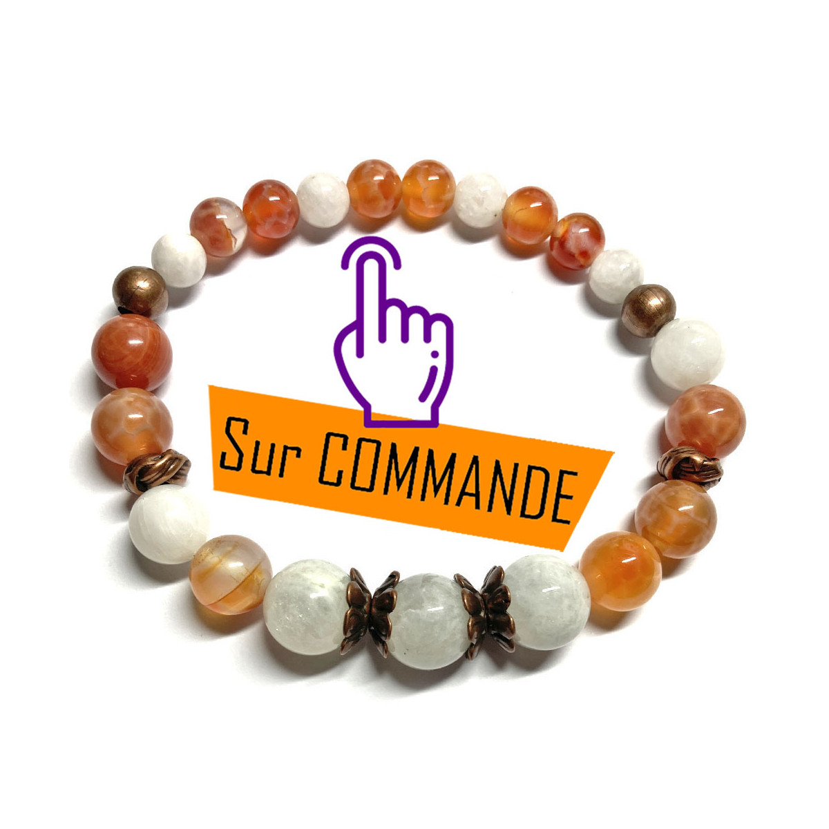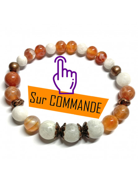 Un bracelet boules pour femme qui est une création unique, un bracelet très original grâce à ses quatre coupelles cuivrées qui séparent des perles en Pierre de Lune de 10 mm, mais aussi ses deux rondelles en forme de nœuds toujours cuivrées et ses deux perles rondes assorties.. Les perles, de 8 mm, sont positionnées de façon asymétrique tandis que celles en 6 mm sont montées symétriquement. Comme vous pouvez le voir les perles de couleur blanche sont de la Pierre de Lune et celles orangées sont en Agate Feu. La Pierre de Lune et l'Agate Feu sont des Pierres naturelles ou pierres semi-précieuses. En Lithothérapie, les pierres naturelles font l'objet d'études qui révèlent les bienfaits des minéraux. Commençons par la première pierre naturelle, La Pierre de Lune. La Pierre de Lune est la pierre de la féminité car elle stimule l'aspect féminin, le côté Yin de notre nature et rééquilibre les énergies masculines et féminines. Ce joli minéral apaise les émotions et aide à une stabilité émotionnelle. La Pierre de Lune permet de s'ouvrir en profondeur aux sentiments. Toujours en lien avec la féminité, cette pierre semi-précieuse permet également de stimuler le développement de l'intuition. La Pierre de Lune apporte une aide lors des changements naturelles de la femme, comme réduire les douleurs liées aux règles douloureuses ou aux bouffées de chaleur. Continuons avec la seconde pierre naturelle, ici présente, qui est L'Agate Feu et qui s'appelle également peau de serpent. C'est une pierre naturelle d'ancrage car ce minéral est relié à la terre, son lien à la terre est très fort. L'énergie apaisante de cette belle pierre naturelle donne un sentiment de sécurité et de confiance. L'Agate Feu aide à canaliser nos émotions et nos énergies. Cette pierre pierre semi-précieuse est dotée d'une énergie ayant une grande force de protection et spécialement contre les malédictions. Effectivement tel un bouclier autour du corps, l'Agate Feu les renvoie à leur source. En Lithothérapie, l'Agate Feu aiderait vivement à calmer les bouffées de chaleurs. Un bracelet conseillé pour limiter les bouffées de chaleur, activer la stabilité émotionnelle et la féminité.