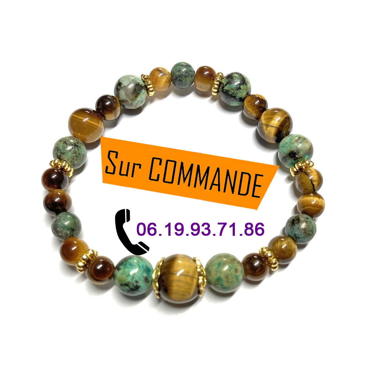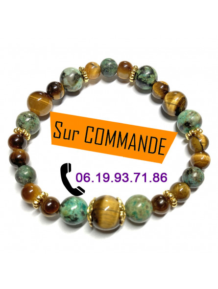 Bracelet boules, pour femme en Œil de Tigre et Turquoise d'Afrique composé de petites boules ou perles en pierres naturelles semi-précieuses pour la Lithothérapie. Un bracelet de création unique et originale d'un diamètre de 47 mm et d'une longueur de 17.5 cm composé de minéraux pour un bien-être au quotidien.