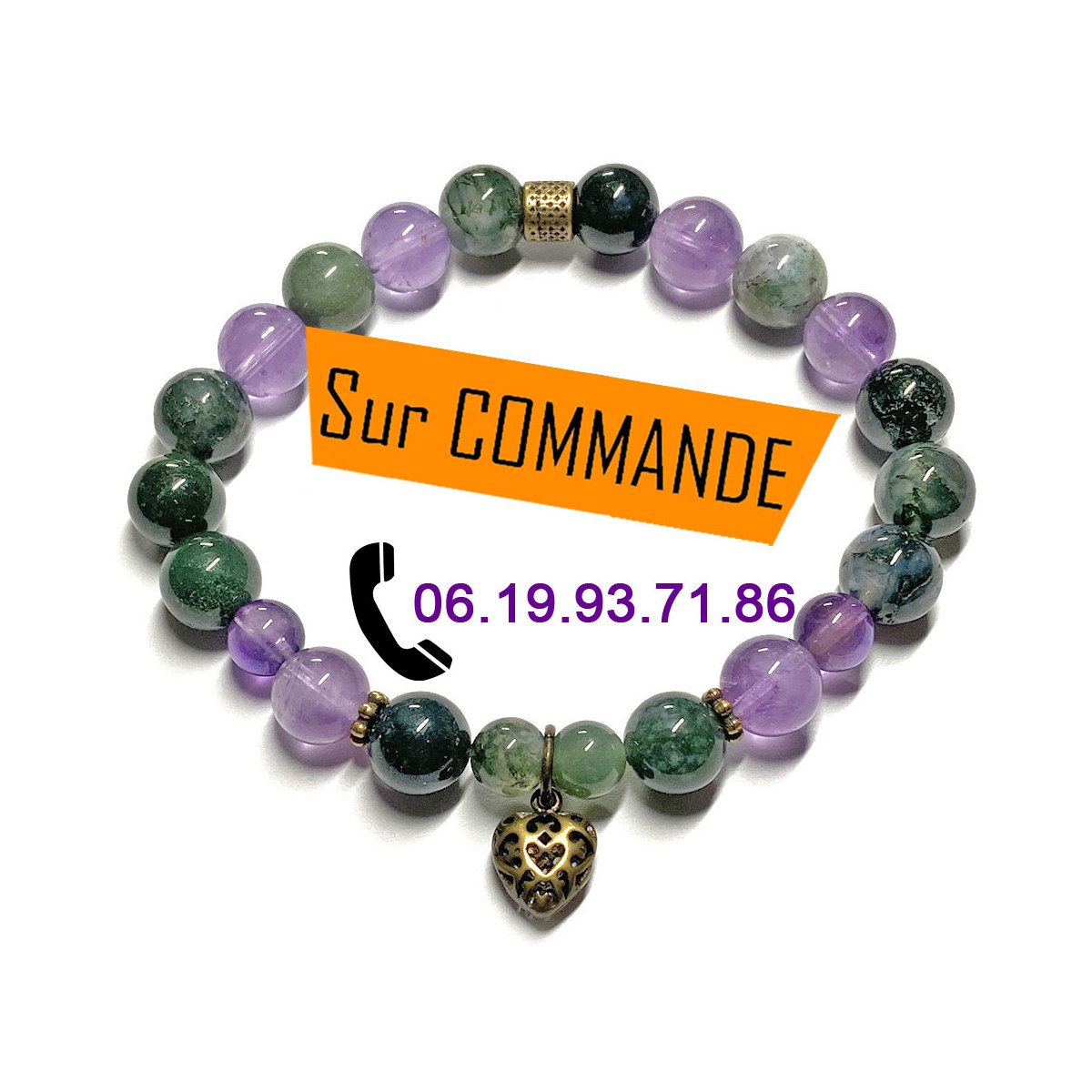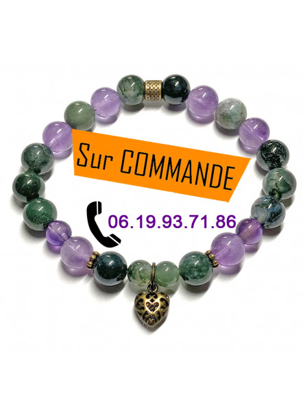 Ce bracelet boules pour femme est une création unique. Un bracelet boules original avec un pendentif cœur filigrané couleur bronze ainsi que deux rondelles fleurs et un tube eux aussi de couleur bronze. Cette création est réalisée avec deux pierres naturelles ou semi-précieuses qui sont l'Améthyste et l'Agate Mousse, en perles de 6 et 8 mm, placées de façon symétrique. Nous sommes dans le cadre de la Lithothérapie qui permet l'étude des bienfaits des minéraux et leurs vertus. Ce duo est particulièrement apprécié que ce soit pour les bienfaits de chacune des ces deux pierres naturelles ici associées que pour l'esthétique. Commençons par l'Agate Mousse. L'Agate Mousse ferait partie des pierres "porte-bonheur", selon la tradition. Ce minéral élimine la pression et décharge de certains poids. L'Agate Mousse permet de visualiser la beauté des choses de l'environnement. L'Agate Mousse, c'est aussi la pierre naturelle des nouveaux commencements. Cette pierre semi-précieuse permet d'écarter les blocages ou les obstacles spirituels. Cette belle pierre verte naturelle symbolise l'estime de soi, la confiance en soi et la communication avec autrui. Ce qui caractérise l'Agate Mousse c'est l'aide au lâcher prise, la sérénité et à la stabilité. Continuons avec l'Améthyste qui est une belle pierre naturelle violette. L'Améthyste est en Lithothérapie, la pierre naturelle qui favorise l'élévation spirituelle, la méditation et la concentration. L'Améthyste apaise et calme le mental. Ce beau minéral apaise, également, les angoisses, les colères et l'hystérie. C'est la pierre naturelle du rééquilibrage mental. L'Améthyste améliore notre qualité énergétique, elle est également une pierre de purification. Un bracelet pour la paix du mental et le lâcher prise et pour un petit poignet.