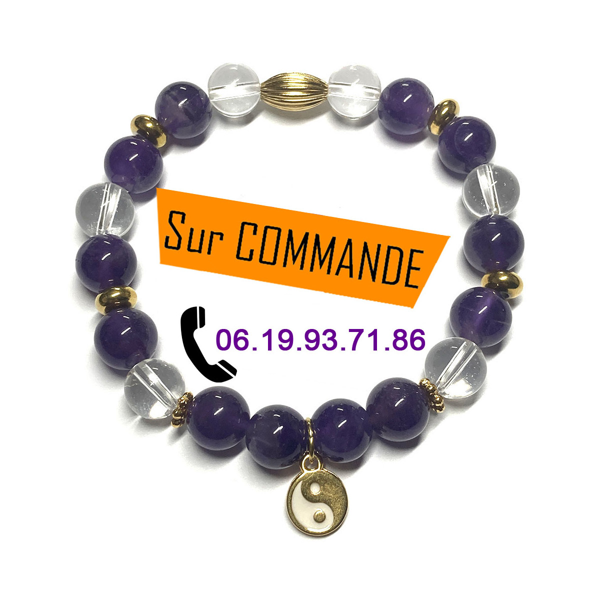 Ce bracelet boules pour femme est une création unique, pour un poignet fin. Il est très original avec son pendentif en acier inoxydable doré et représentant le symbole du Yin et du Yang , énergie féminine et énergie masculine, une perle striées en acier inoxydable doré également pour plus de féminité, quatre rondelles toujours en acier inoxydable doré et pour finir deux rondelles fleur cette fois-ci, dorées à l'or fin. Ce joli bracelet boules symétrique est composé de deux pierres naturelles ou semi-précieuses qui sont l'Améthyste et Le Cristal de Roche en perles de 8 mm. En Lithothérapie, les vertus des minéraux sont reconnus pour l'apport des bienfaits des pierres, et notre réactivité. Ainsi ce bracelet féminin, composé d'Améthyste et de Cristal de Roche apportera les bienfaits de chacune des pierres. Commençons par l'Améthyste. L'Améthyste est reconnue en Lithothérapie pour favoriser l'élévation spirituelle, la concentration et la méditation. Ce minéral calme le mental, apaise les angoisses, les colères et l'hystérie. C'est la pierre semi-précieuse du rééquilibrage mental. L'Améthyste améliore notre qualité énergétique, elle est également pierre naturelle de purification. La seconde pierre naturelle de ce bijou est le Cristal de Roche. Le Cristal de Roche a la particularité d'être une pierre d'énergie. A côté de l'Améthyste , elle va permettre aux bienfaits de cette pierre naturelle d'être amplifiés car le Cristal de Roche dynamise les autres pierres semi-précieuses. Ce minéral stimule les flux énergétiques, comme les nerfs ou le cerveau. Avec sa transparence, le Cristal de Roche émane une sentiment de pureté, il aide à la clarté de l'esprit. Cette pierre semi-précieuse aide à la méditation et à la relaxation Un bracelet pour la paix du mental, la méditation et la clarté de l'esprit.