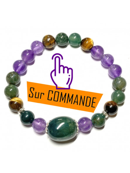 Ce bracelet boules pour femme est une création unique. Un bracelet boules original avec une grosse perle ovale en Agate Mousse entourée de deux coupelles fleur en Argent, ainsi que, intercalées aux perles, deux rondelles striées en Argent également. Cette création, très féminine, est réalisée avec trois pierres naturelles ou semi-précieuses qui sont l'Agate Mousse, l'Améthyste et l'Œil de Tigre en perles de 8 mm et placées de façon symétrique. Nous sommes dans le cadre de la Lithothérapie qui permet l'étude des bienfaits des minéraux et leurs vertus. Ce trio est particulièrement apprécié que ce soit pour les bienfaits de chacune des ces deux pierres naturelles ici associées que pour l'esthétique. Commençons par l'Agate Mousse. L'Agate Mousse ferait partie des pierres "porte-bonheur", selon la tradition. Ce minéral élimine la pression et décharge de certains poids. L'Agate Mousse permet de visualiser la beauté des choses de l'environnement. L'Agate Mousse, c'est aussi la pierre naturelle des nouveaux commencements. Cette pierre semi-précieuse permet d'écarter les blocages ou les obstacles spirituels. Cette belle pierre verte naturelle symbolise l'estime de soi, la confiance en soi et la communication avec autrui. Ce qui caractérise l'Agate Mousse c'est l'aide au lâcher prise, la sérénité et à la stabilité. Continuons avec l'Améthyste qui est une belle pierre naturelle violette. L'Améthyste est en Lithothérapie, la pierre naturelle qui favorise l'élévation spirituelle, la méditation et la concentration. L'Améthyste apaise et calme le mental. Ce beau minéral apaise, également, les angoisses, les colères et l'hystérie. C'est la pierre naturelle du rééquilibrage mental. L'Améthyste améliore notre qualité énergétique, elle est également une pierre de purification. L'Œil de Tigre est la troisième pierre naturelle qui compose ce bracelet boules. L'Œil de Tigre est connu en Lithothérapie pour être une pierre de protection. Ce minéral tel un miroir va renvoyer les énergies négatives vers son émetteur. C'est en chargeant le corps émotionnel en énergie que cette pierre semi-précieuse va rééquilibrer le Yin & le Yang. C'est également en aidant à surpasser les complexes d'infériorité et de timidité que l'Œil de Tigre va permettre d'avoir confiance en soi. Cette pierre semi-précieuse évoque la liberté et le courage. Bracelet idéal pour le lâcher prise, la paix du mental et la protection qui pourrait vous aider au travail ou autre.