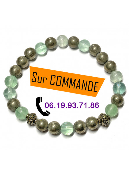 Bracelet boules pour homme, une création unique, une création originale avec deux perles travaillé en métal de couleur bronze et qui sont intercalées aux perles de 8 mm qui sont en pierres naturelles ou pierres semi-précieuses. En Lithothérapie, il est reconnu que chaque pierre naturelle a ses propres vertus et c'est en les portant que nous pouvons profiter des bienfaits des minéraux. La première pierre naturelle, présente sur ce joli bracelet symétrique, est la Fluorite, ou Fluorine. La Fluorite est une pierre naturelle qui permet d'harmoniser les quatre éléments fondamentaux en nous, la terre, l'eau, le feu et l'air. C'est la pierre semi-précieuse idéale pour surmonter toute forme de désorganisation. Grâce à son énergie, la Fluorite aide à développer la concentration et l'esprit d'analyse. A cela ce très joli minéral permet de se libérer des blocages psychologiques, des sensations de stagnation. Équilibrante, la Fluorite ouvre la conscience aux réalités de l'amour inconditionnel. Cette pierre naturelle soulage également les colères et est efficace contre les états de tristesse. Sur le plan physique la Fluorite agirait positivement sur les problèmes cutanés et osseux. La deuxième pierre naturelle est la Pyrite. La Pyrite est la pierre semi-précieuse de l'organisation, de l'ordre, du raisonnement. Ce minéral aide au rétablissement des polarités du corps physique. Un autre bienfait de la Pyrite consiste à faciliter la restructuration du mental, à cela se rajoutent la stimulation des facultés intellectuelles et la rationalité de la pensée. Sur le plan physique la Pyrite améliorerait la santé de voies respiratoires et renforcerait le système nerveux. Un bracelet pour la confiance en soi, l'organisation et les facultés intellectuelles.