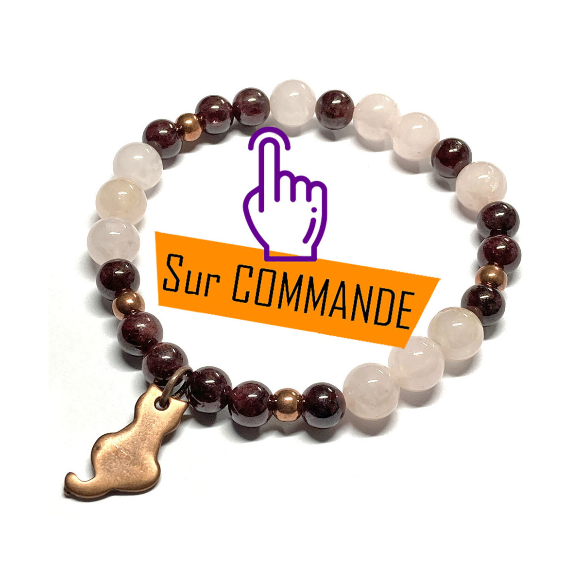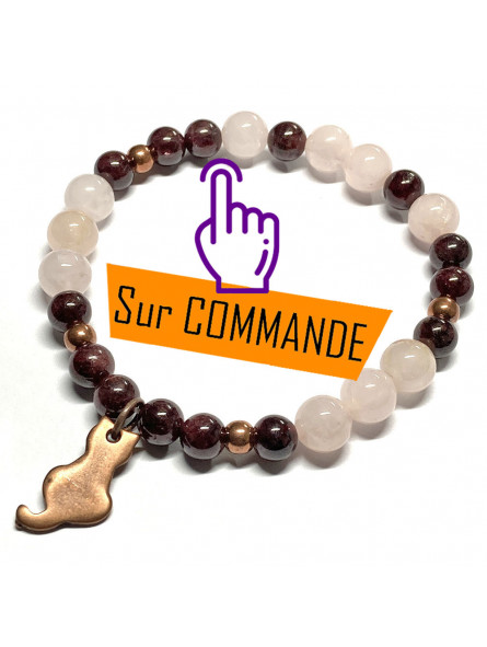 Ce bracelet boules pour femme est une création unique, il est original avec son pendentif en métal cuivré qui représente un chat assis de dos ainsi que ses quatre très jolies petites perles rondes lisses et également cuivrées. Les perles, positionnées de façon symétrique, en 8 mm et en 6 mm sont en pierres naturelles ou semi -précieuses. Les deux minéraux présents sont le Quartz rose et Le Grenat. En Lithothérapie, les bienfaits des pierres naturelles sont répertoriées selon leurs vertus. Commençons tout d'abord ici par le Quartz Rose, en perles de 8 mm. Le Quartz Rose est reconnu comme la pierre naturelle de l'amour, de la douceur, de la paix. Le Quartz Rose libère les angoisses. Ce beau minéral rose soulage les blessures de l'âme. Grâce au Quartz Rose douceur et tendresse s'expriment dans les rapports humains. Le Quartz Rose aide à aimer de nouveau. Au niveau physique le Quartz Rose calmerait les migraines. Continuons avec la seconde pierre naturelle de ce bracelet boules très féminin est le Grenat, en perles de 6 mm. Le Grenat améliore la confiance en soi et l'estime de soi. Cette très jolie pierre naturelle aide au courage, à la compassion et également à la sérénité. Le Grenat est pierre de régénération et d'énergie. Cette pierre semi-précieuse permet de se protéger des cauchemars. Pour vous ce bracelet vous apporterait amour, douceur et confiance en soi.