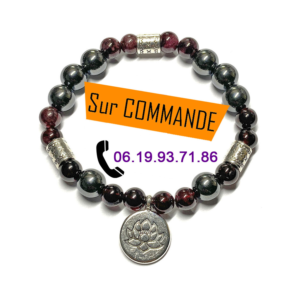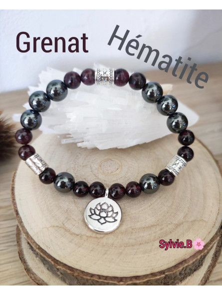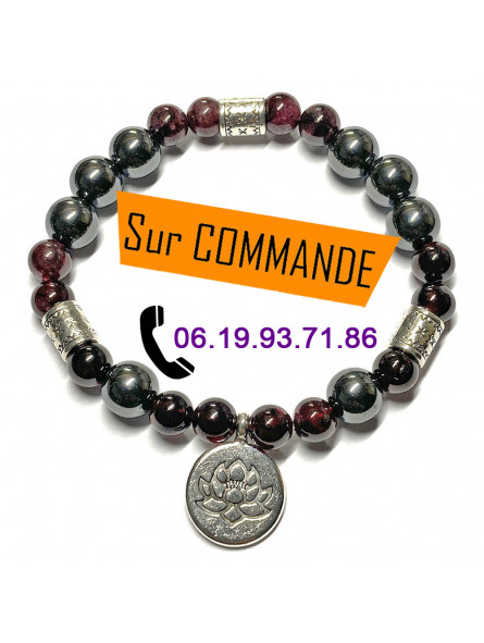 Bracelet Boules en Grenat & Hématite avec un Lotus
