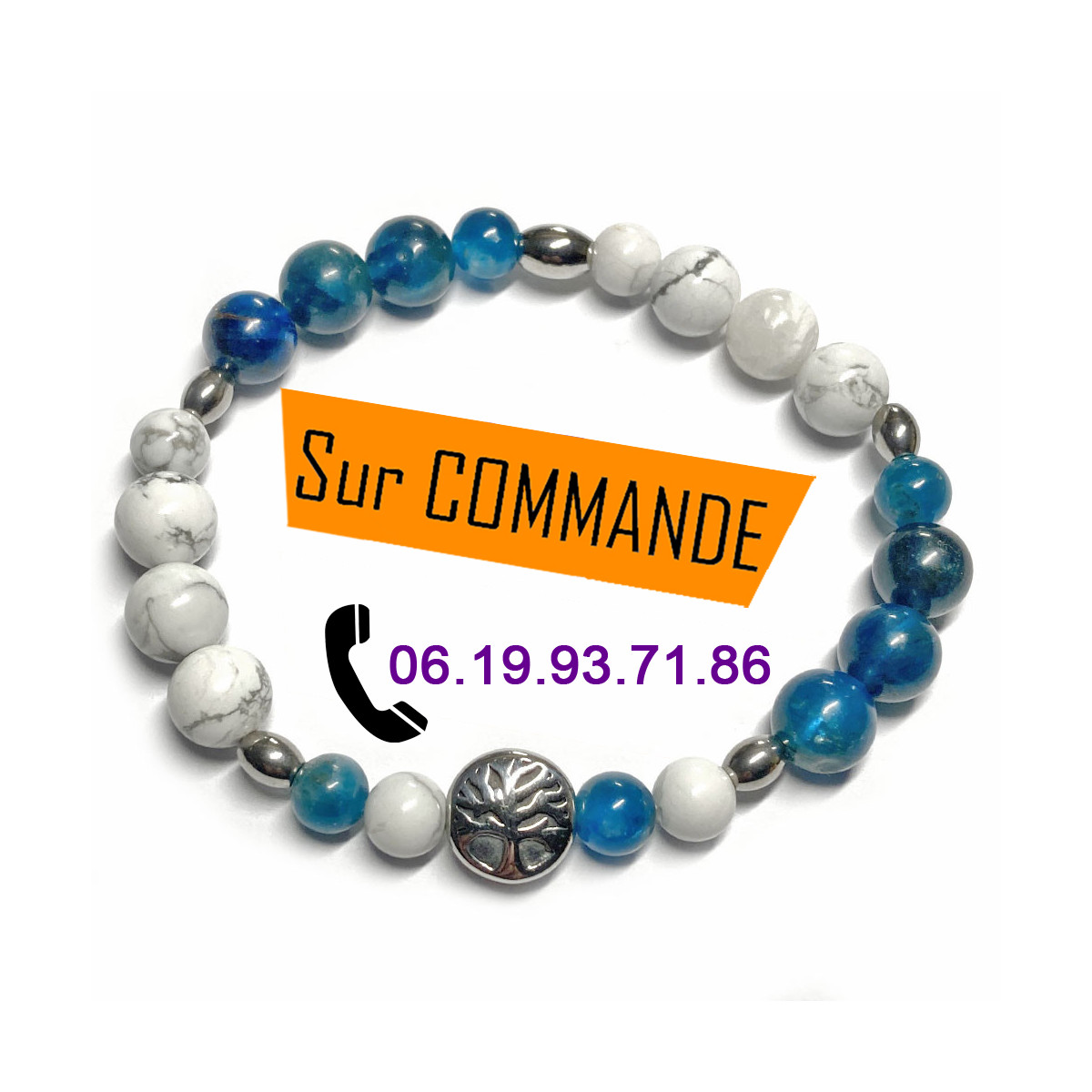 Ce bracelet boules pour femme est une création unique. Un bracelet féminin qui est très original avec une perle, en acier inoxydable argenté, représentant un arbre de vie ainsi que quatre petites perles ovales et une plus grosse , toutes les cinq elles aussi en acier inoxydable argenté. Le bracelet est composé de perles en pierres naturelles ou pierres semi-précieuses qui se nomment l'Apatite et la Howlite en perles de 6 et 8 mm. En Lithothérapie, les pierres naturelles ou semi-précieuses sont étudiées quant à leurs vertus et c'est en les portant que nous bénéficions des bienfaits des minéraux. La première pierre naturelle de ce duo est l'Apatite. L'Apatite est en lien avec le Chakra de la gorge et favorise du coup la communication de groupe idéalement. Par la même occasion cette belle pierre semi-précieuse bleue ou bleu-vert favoriserait une meilleure expression des émotions. L'Apatite aide à canaliser le trop plein d'émotion, tout comme les troubles émotionnels. Ce minéral aide au calme dans toutes les situations et à apaiser les tensions. Cette pierre naturelle aide à rendre service, et bien sûr à avoir une attitude humanitaire. L'Apatite invite à l'altruisme. La deuxième pierre naturelle de ce joli duo est la Howlite, elle est blanche et souvent marbrée de noir. Ce minéral permet un bon équilibre et aide au discernement. La Howlite aide également à éliminer la fureur et se libérer de la colère incontrôlée. La Howlite est la pierre naturelle de la patience, du calme et de la détente. C'est le minéral connu également sur le plan physique pour aider à éliminer la rétention d'eau. Cette association de pierres naturelles de Howlite et d' Apatite est conseillée lors d'un programme de minceur ou de régime. Effectivement l'Apatite va contribuer à surmonter les problèmes liés à l'alimentation émotionnelle, ceux liés à la nourriture et la Howlite, comme vu précédemment aide à l'élimination de la rétention d'eau. Un bracelet qui aidera à la perte de poids avec patience et calme.