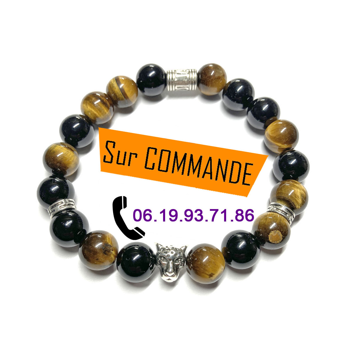 Un bracelet boules pour homme, une création qui est unique et originale avec une perle en métal argentée représentant un léopard ainsi que deux rondelles striées en métal argentée et un intercalaire en forme de colonne travaillée toujours en métal argenté. Ce bracelet boules est composé de deux pierres naturelles, appelées également pierres semi-précieuses. Ces deux minéraux sont l'Onyx et l'Œil de Tigre en perles boules de 10 mm En lithothérapie, on reconnait aux pierres naturelles des vertus et lorsque nous les utilisons, elles nous offrent leurs bienfaits. Ce bracelet masculin est donc un bracelet bien-être. La première pierre de ce bijou est l'Onyx. L'Onyx est symbole de force, pierre d'ancrage à la terre, très beau minéral noir. C'est une pierre naturelle qui est un soutien dans les moments difficiles en recentrant les énergies. L'Onyx est une pierre semi-précieuse de protection car elle disperse les énergies négatives et permet la stabilité. C'est aussi une pierre qui aide à la confiance en soi en développant le sens des responsabilités et le self contrôle. L'Onyx favorise les rêves divinatoires tout comme l'intuition mais tout en protégeant des influences néfastes. La seconde pierre est l'Œil de Tigre. L'Œil de Tigre est également une pierre naturelle de protection. Elle fonctionne tel un miroir. Effectivement l'Œil de Tigre renvoie les énergies négatives vers son émetteur. Cette belle pierre semi-précieuse est celle de la liberté, de la projection personnelle, du courage. Ce minéral rééquilibre le Yin et le Yang en chargeant en énergie le corps émotionnel. Pierre naturelle qui évoque la confiance en soi car elle aide à surpasser les complexes d'infériorité et de timidité. Sur le plan physique, l'Œil de Tigre et atténuerait les crises d'asthmes et régulerait les surrénales .