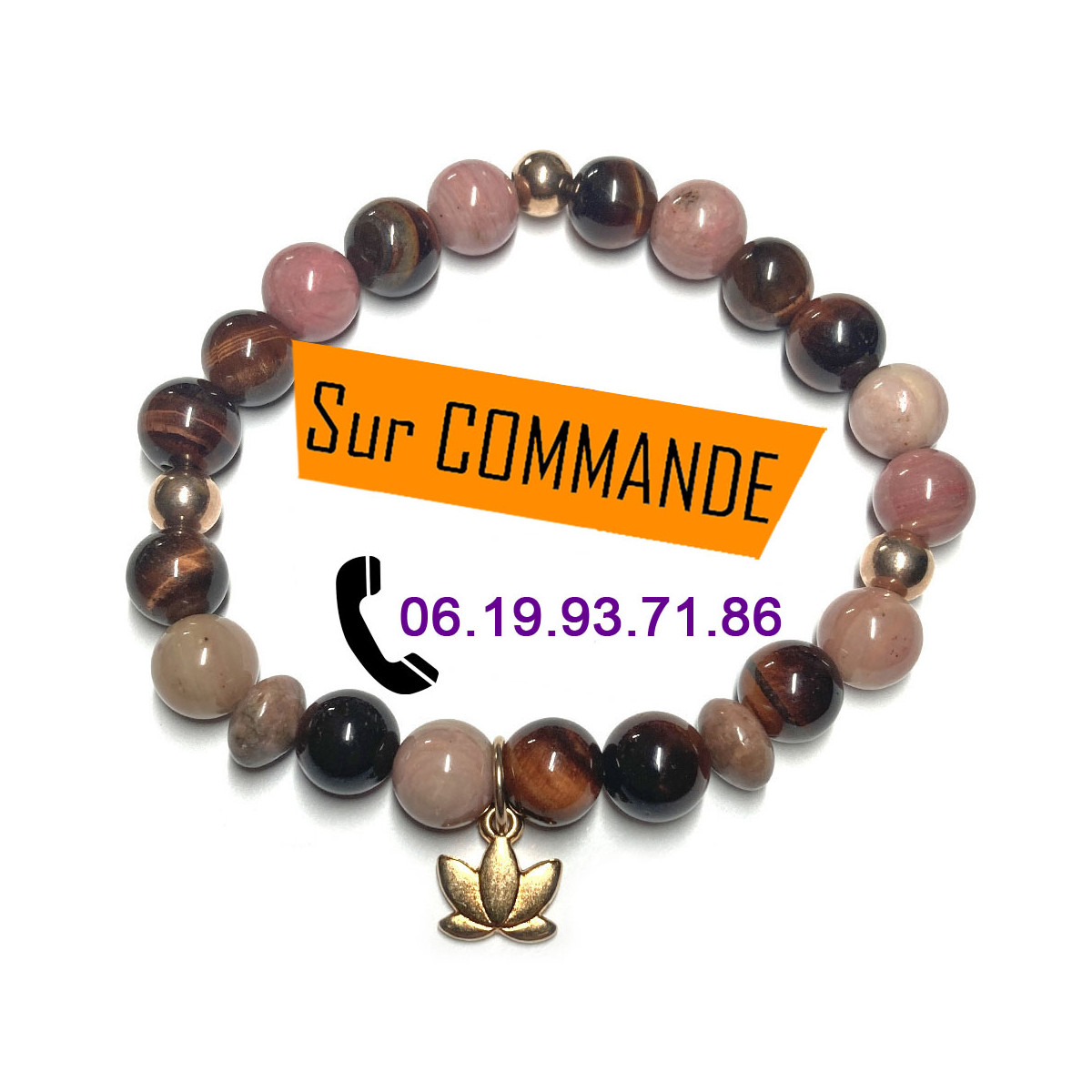 Un bracelet boules pour femme qui est une création unique et très originale avec un joli pendentif représentant un lotus doré rosé, trois perles rondes en Argent 925, dorées rosé. Un bracelet asymétrique, réalisé avec des perles 8 mm en pierres naturelles ou pierres semi-précieuses. Les deux minéraux qui composent ce très joli bracelet boules sont la Rhodonite et l’Œil de Taureau. En Lithotérapie, les vertus des pierres naturelles sont étudiés et c'est pour cela que les bienfaits des minéraux sont reconnus. Commençons avec la première pierre naturelle qui est présente sur ce bracelet féminin et élégant, à savoir la Rhodonite. La Rhodonite soulage les blessures émotionnelles. Cette jolie pierre semi-précieuse stimule et active le Chakra du cœur. Ainsi ce minéral aiderait à renforcer les liens affectifs. L'action purifiante de la Rhodonite contribue à mettre en évidence les émotions négatives refoulées pour les transformer et les éliminer. Cette pierre naturelle souvent appelée pierre de l'amour, protège aussi de la jalousie d'autrui. La Rhodonite protège également des agressions et des assiduités amoureuses excessives. Cette pierre naturelle réduit également les angoisses et les peurs. La Rhodonite permettrait de libérer les rancœurs et les colères liées au passé. C'est une pierre semi-précieuse de douceur et de tendresse. La seconde pierre naturelle de ce très joli bracelet est l'Œil de Taureau, ou que l'on appelle également Œil de Bœuf. Toutes pierres nommées Œil de, sont des pierres de protection. L'Œil de Taureau, comme l'Œil de Tigre, tel un miroir, renvoie les énergies négatives à son émetteur. L'Œil de Taureau aide au développement du courage et de la force intérieure. Ce minéral encourage à l'instinct de survie. Pierre semi-précieuse d'enracinement et qui stabilise. L'Œil de Taureau aide à avoir un esprit combatif. Avec cette pierre naturelle vous serez amenée à prendre des initiatives et entreprendre de nouveaux projets. Elle aidera à la confiance en soi et à l'indépendance. L'Œil de Taureau ou de Bœuf équilibre aussi le yin & le Yang. Ce bracelet est idéal pour se libérer émotionnellement, en étant protégée et confiante.
