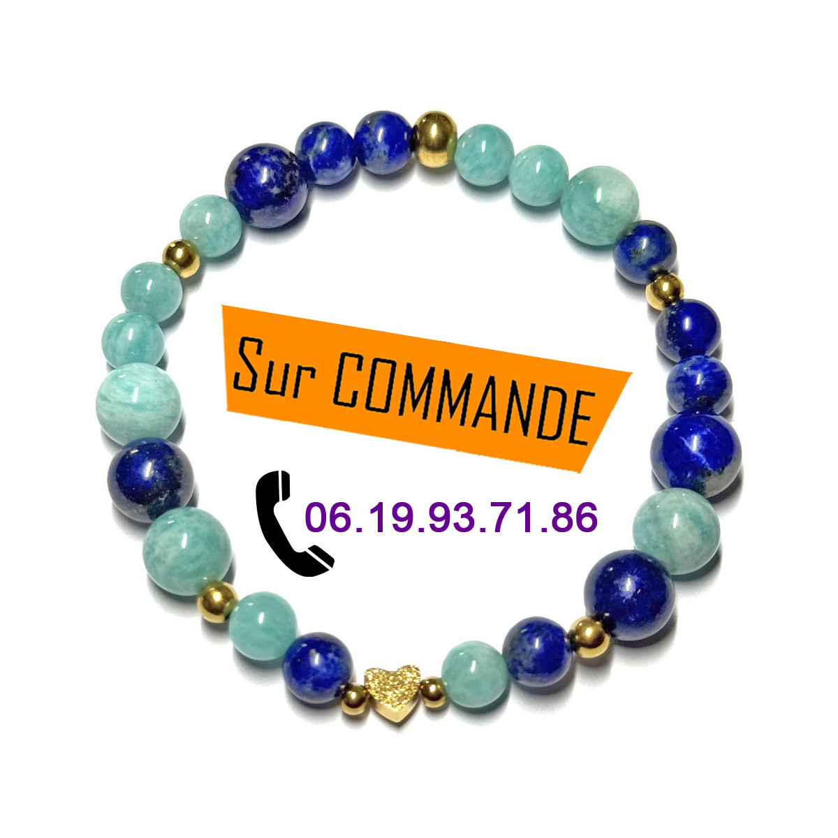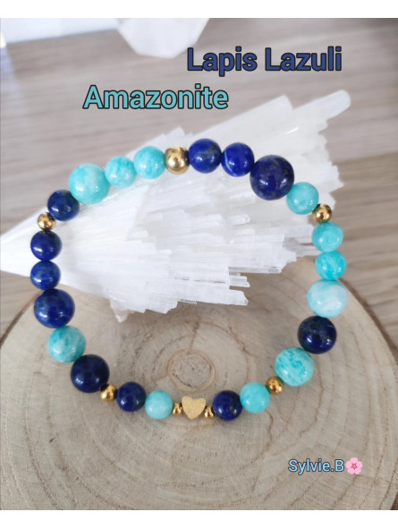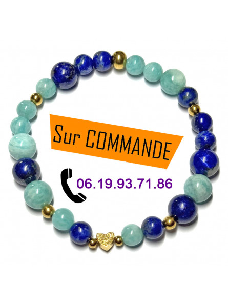 Ce bracelet boules pour femme est une création unique, un bracelet très original, qui est très féminin avec une perle représentant un cœur diamanté en acier inoxydable doré, entouré de deux petites perles aussi en acier inoxydable doré, mais également quatre autres perles un peu plus grosses en acer inoxydable doré et enfin une perle de 6 mm aplatie également en acier inoxydable doré. Ils sont intercalés aux perles naturelles ou semi précieuses qui composent ce bracelet unique. Les deux minéraux en perles de 6 et 8 mm sont le Lapis Lazuli ou Lazurite et l'Amazonite. En Lithothérapie, les pierres naturelles ou semi-précieuses sont reconnues par leurs vertus et les bienfaits des minéraux. Un bracelet boule pour poignet fin, symétrique dans l'emplacement des dimensions des perles et asymétrique dans le choix des deux minéraux. Commençons par la première pierre naturelle qui est le Lapis Lazuli ou Lazulite. Le Lapis Lazuli est un minéral qui aide à débloquer les chakras de la gorge et du troisième œil, sa couleur est en lien d'ailleurs avec ces deux chakras. C'est donc pour cela que cette très jolie pierre naturelle stimule l'expression des sentiments et des émotions. Cette pierre semi- précieuse facilite également les relations d'amitié ou d'amour mais aussi la communication avec autrui. En Lithothérapie le Lapis Lazuli est reconnu comme étant un instrument de purification du mental, de l'éveil des facultés extrasensorielles. Cette pierre naturelle permet la réalisation spirituelle et protège contre les attaques psychiques, ceci grâce à la sérénité dont elle dégage. C'est en permettant la mise en relation avec les esprits Gardiens que le Lapis Lazuli ou Lazulite identifie l'attaque, la bloque et renvoie l'énergie vers sa source. Le Lapis Lazuli donne un regain de confiance et encourage à reprendre sa vie en main. L'Amazonite, la seconde pierre semi précieuse présente sur ce joli bracelet boules, est une pierre naturelle qui vous donnera une sensation de bonheur, de tendresse. Cette très belle pierre semi-précieuse aide à l'apaisement lors d'un sentiment de frustration et procure alors de la sérénité. L'Amazonite libère également de la culpabilité pour les autres ou pour soi-même. Cette douce pierre naturelle facilite la vision claire de nos tendances nuisibles pour s'en libérer. C'est en équilibrant le Yin & le Yang que l'Amazonite va vous permettre de voir les deux côtés d'un problème ou les autres points de vue. L'Amazonite apporte un sentiment de joie, de paix et de sécurité. Cette pierre semi-précieuse est le symbole de la manifestation de l'Amour Universel. Sur le plan physique, l'Amazonite lutterait contre les états de tristesse, mais aussi régulerait les carences sexuelles. Les articulations et les crampes seraient elles aussi soulagées avec l'Amazonite