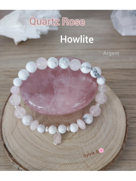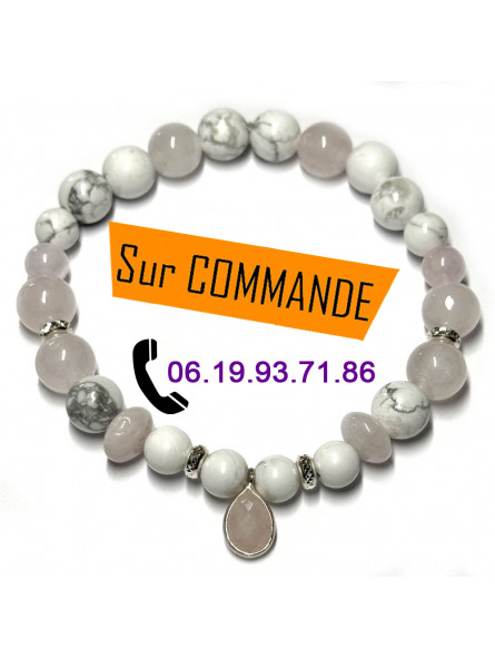 Un bracelet boules pour femme, une très belle création qui est unique. C'est un bracelet boules symétrique, féminin et original avec un pendentif en Quartz Rose en forme de goutte, en Argent et quatre rondelles striées également en Argent, sans oublier des perles en forme de rondelles en Quartz Rose. L'essentiel des perles qui composent ce bracelet féminin sont en pierres naturelles ou semi-précieuses, de 6 et 8 mm de diamètre. Le nom de chacun de ces deux minéraux associés sont le Quartz Rose et la Howlite. En Lithothérapie, on sait que les minéraux ont chacun différentes vertus et que c'est en les portant que nous bénéficions des bienfaits des pierres naturelles. Commençons par la première pierre naturelle qui est le Quartz Rose. Le Quartz Rose est le minéral qui émane de la paix, de l'amour. Cette douce pierre naturelle aide à libérer les angoisses. Le Quartz Rose guérit les blessures de l'âme. Ainsi cette belle pierre semi-précieuse permet d'accepter et d'aimer une nouvelle fois. Le Quartz Rose représente l'amour universel. Cette beau minéral rose apporte tendresse et douceur dans les rapports humains. Sur le plan physique, le Quartz Rose allégerait les migraines. La seconde pierre naturelle présente sur ce bracelet boules en duo avec le Quartz Rose est la Howlite. La Howlite, c'est la pierre naturelle de la patience, du calme mais aussi de la détente. Cette belle pierre semi-précieuse, blanche marbrée de noir, permet un bon équilibre et aide au discernement. La Howlite aide également à éliminer la fureur et la colère incontrôlée. C'est un minéral connu également sur le plan physique pour aider à éliminer la rétention d'eau. Un bracelet pour la patience, le calme la douceur et l'amour.