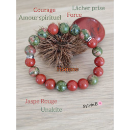 Un bracelet boules pour homme, une très belle création unique, originale avec sa perle qui représente une tête de lion, symbole de justice et de bravoure et ses quatre rondelles Heiski en métal argenté. Les deux pierres naturelles ou semi-précieuses sur ce bracelet boules pour homme sont la Chrysprase et l'Onyx. En Lithothérapie, les pierres naturelles sont identifiées et répertoriées quant aux vertus de chacune d'elles et reconnues pour aider grâce à leurs bienfaits. Commençons par le premier minéral qui est la Chrysoprase. La Chrysoprase est la pierre naturelle de la douceur et de la compassion. Cette belle pierre semi-précieuse apaise les colères et elle apaise également les sentiments négatifs, comme la rancune ou la jalousie. Ainsi la Chrysoprase permet de favoriser les relations humaines. Cette pierre naturelle est conseillée pour démarrer une nouvelle étape dans la vie. Elle permet de se remettre en question, et aide à prendre du recul. La Chrysoprase est une pierre en lien avec le chakra sacré et le chakra du cœur, elle fait entrer l'énergie universelle dans le corps physique. C'est en dirigeant l'attention sur les actions et pensées positives, mais aussi en dissipant les vibrations et les idées noires que ce très joli minéral apporte un sentiment de sécurité et de confiance. La Chrysoprase est une pierre naturelle de confiance en soi, pierre semi- précieuse de patience, qui réduit la nervosité, pierre de courage, pierre de renouveau, elle est idéale pour le nouveaux départs. La seconde pierre naturelle présente est l'Onyx. L'Onyx est symbole de force, un très beau minéral noir qui ancre à la terre. C'est une pierre naturelle qui est un soutien dans les moments difficiles en recentrant les énergies. L'Onyx est une pierre semi-précieuse de protection car elle disperse les énergies négatives et permet la stabilité. C'est aussi une pierre naturelle qui aide à la confiance en soi en développant le sens des responsabilités et le self contrôle. Cette pierre semi-précieuse favorise les rêves divinatoires tout comme l'intuition mais tout en protégeant des influences néfastes. Un bracelet pour la confiance, la sécurité, la protection, le self contrôle