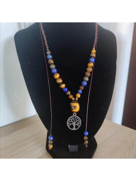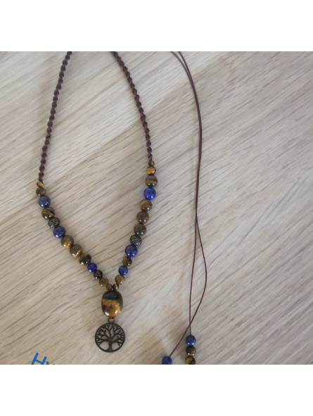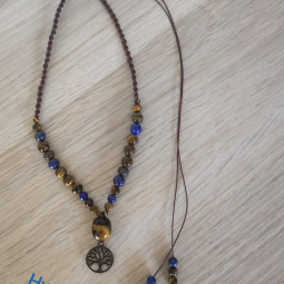 Un collier boules réglable pour femme, une création unique, un bijou original et construit de façon asymétrique avec son très joli pendentif représentant un arbre de vie couleur bronze suivi d'un perle ovale en Œil de Tigre, deux perles travaillées bronze s'intercalent aux perles en 8, 6 et 4 mm en pierres naturelles ou semi-précieuses qui composent ce très joli collier boules. Il y a deux pierres naturelles présentes sur ce collier boules et micro macramé hyper féminin qui sont l'Œil de Tigre et le Lapis Lazuli. En Lithothérapie, les bienfaits des pierres naturelles sont étudiés et reconnus pour nous faire profiter de leurs vertus. Le premier minéral de ce collier boules est l'Œil de Tigre. L'Œil de Tigre est connu en Lithothérapie pour être une pierre de protection. Ce minéral tel un miroir va renvoyer les énergies négatives vers son émetteur. C'est en chargeant le corps émotionnel en énergie que cette pierre semi-précieuse va rééquilibrer le Yin & le Yang. C'est également en aidant à surpasser les complexes d'infériorité et de timidité que l'Œil de Tigre va permettre d'avoir confiance en soi. Cette pierre semi-précieuse évoque la liberté et le courage. Continuons avec la seconde pierre naturelle qui est le Lapis Lazuli ou Lazulite. Le Lapis Lazuli est un minéral qui aide à débloquer les chakras de la gorge et du troisième œil, sa couleur est en lien d'ailleurs avec ces deux chakras. C'est donc pour cela que cette très jolie pierre naturelle stimule l'expression des sentiments et des émotions. Cette pierre semi- précieuse facilite également les relations d'amitié ou d'amour mais aussi la communication avec autrui. En Lithothérapie le Lapis Lazuli est reconnu comme étant un instrument de purification du mental, de l'éveil des facultés extrasensorielles. Cette pierre naturelle permet la réalisation spirituelle et protège contre les attaques psychiques, ceci grâce à la sérénité dont elle dégage. C'est en permettant la mise en relation avec les esprits Gardiens que le Lapis Lazuli ou Lazulite identifie l'attaque, la bloque et renvoie l'énergie vers sa source. Le Lapis Lazuli donne un regain de confiance et encourage à reprendre sa vie en main. Un collier de protection, de communication et d'expression des émotions.
